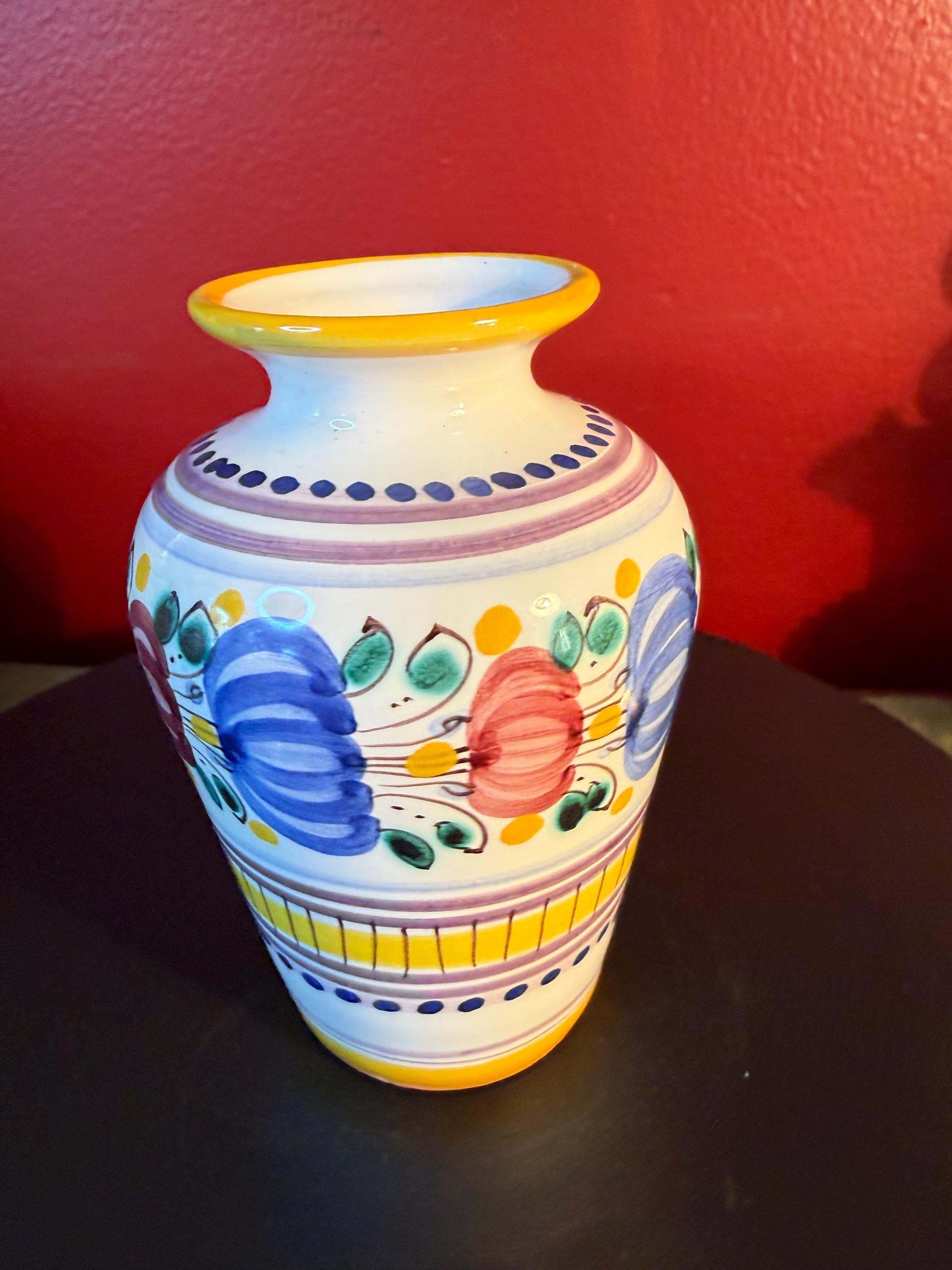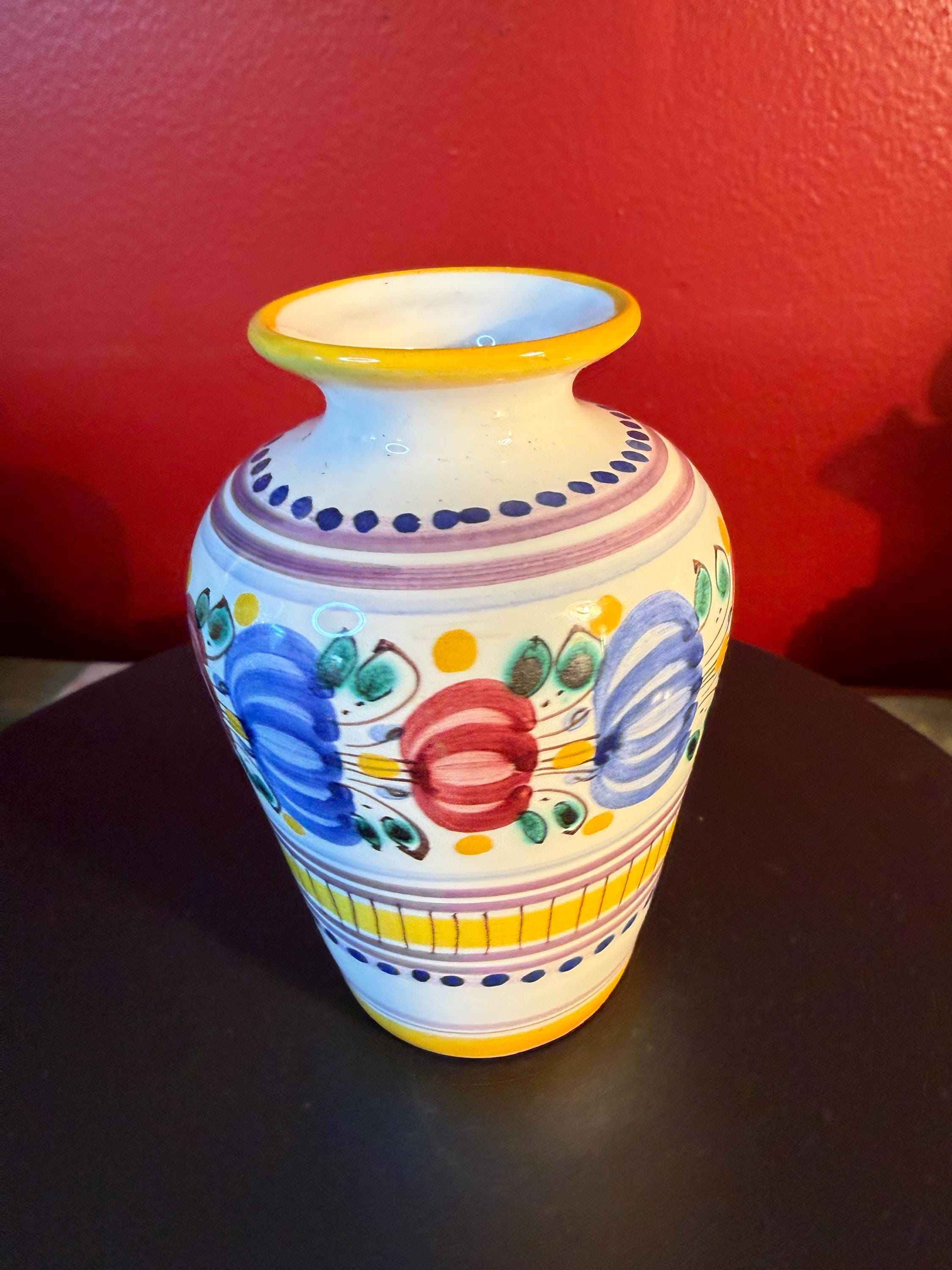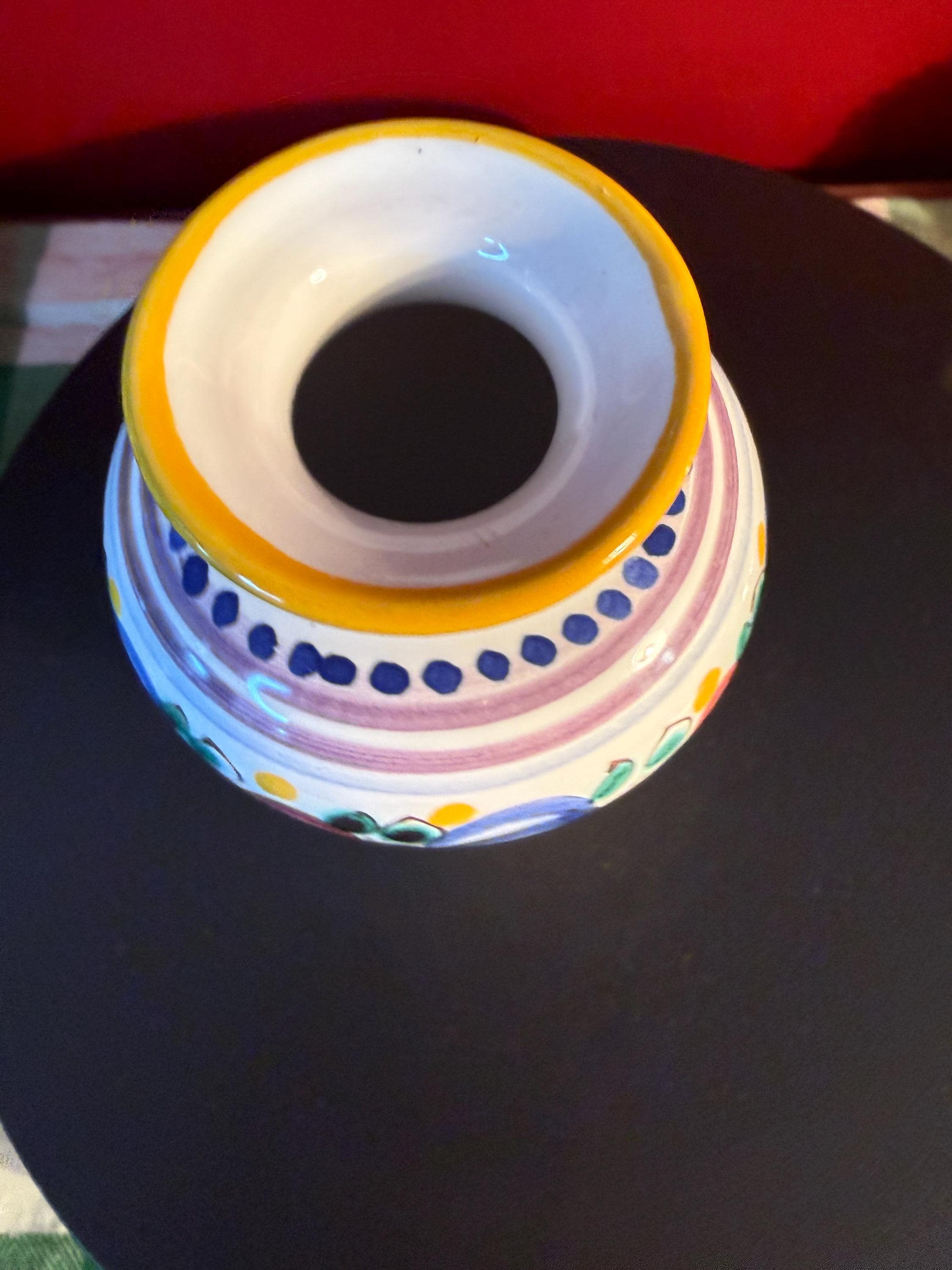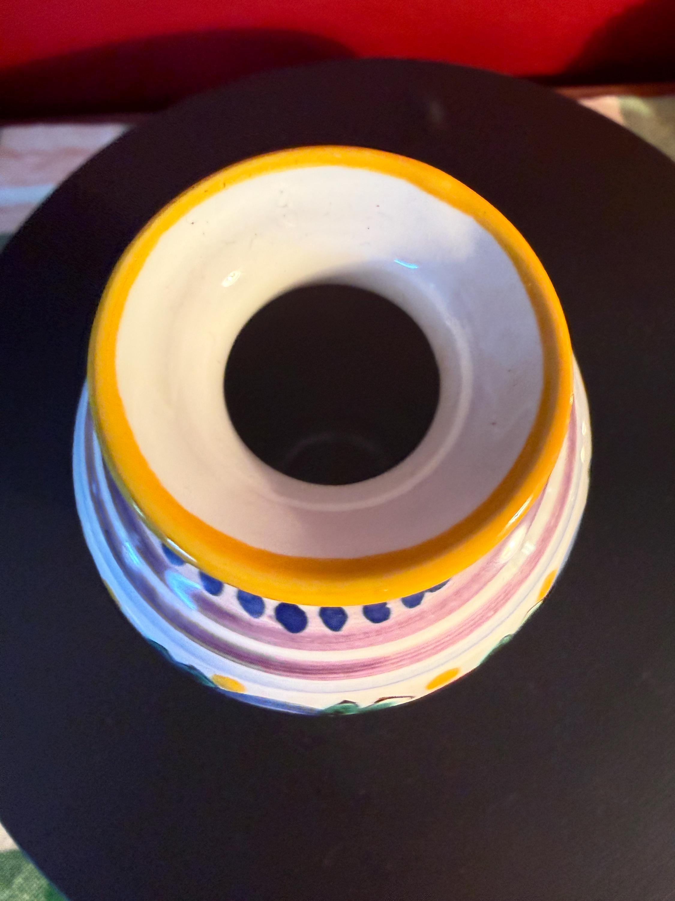 This charming VINTAGE MODRA SLOVAK LUDOVA MAJOLIKA CREMIG MINI VASE is a beautiful example of traditional Slovak pottery craftsmanship. Standing 3 inches tall, it features a creamy base adorned with hand-painted floral folk art motifs in vibrant blues, reds, greens, and yellows, accented by delicate purple stripes and dotted borders. The bright yellow rim adds a sunny finish, making this miniature vase a delightful accent piece for any collection.