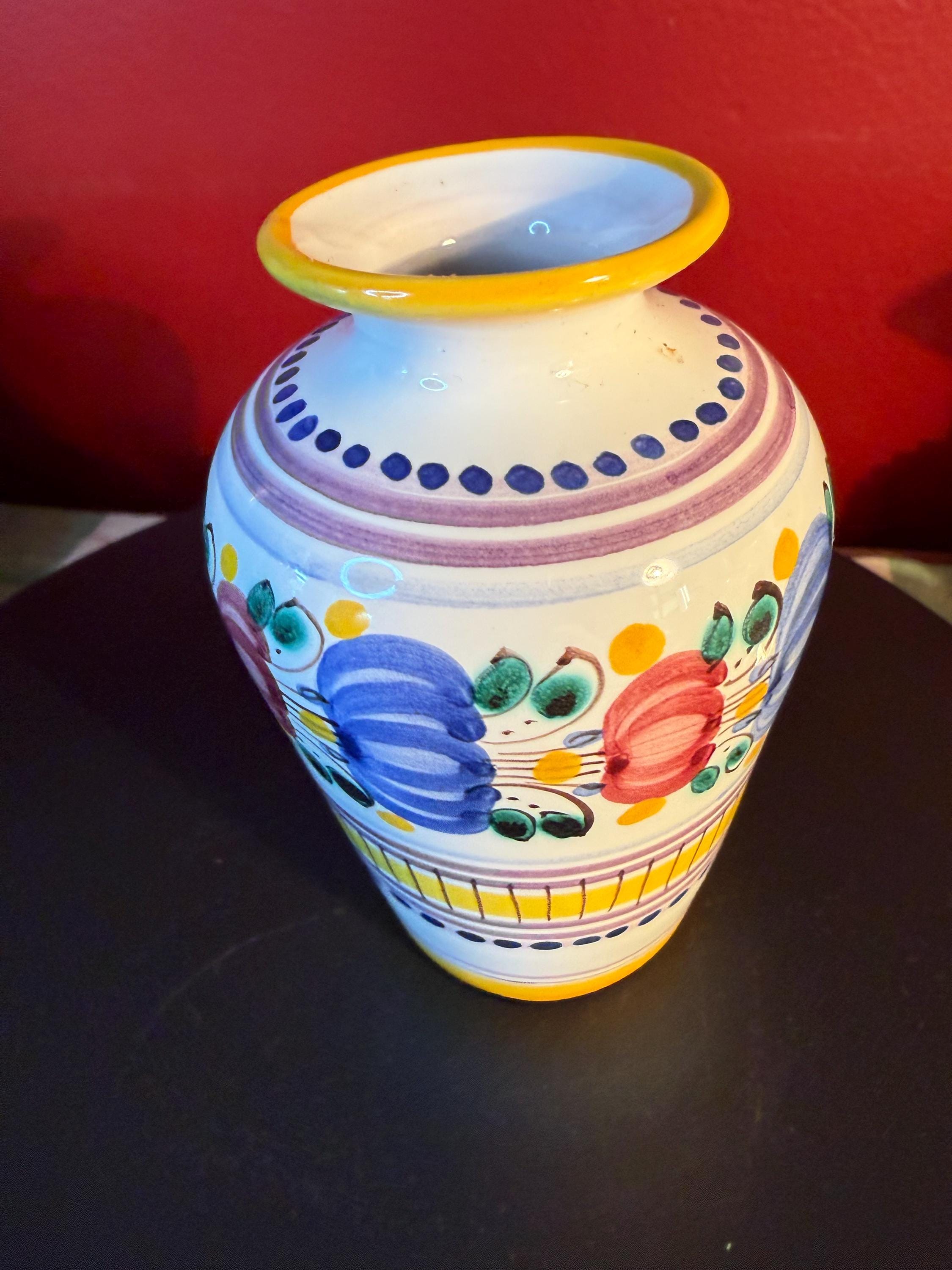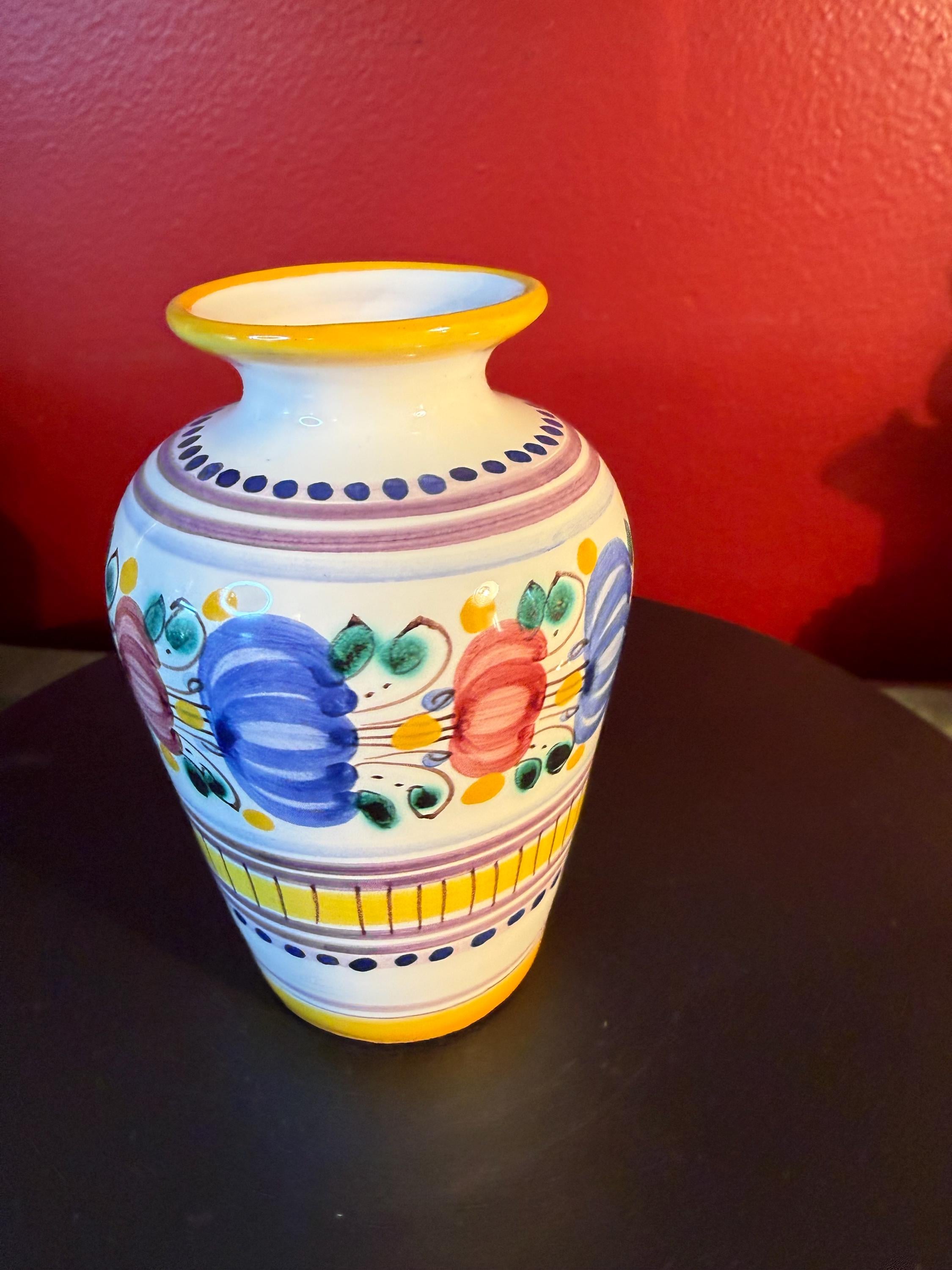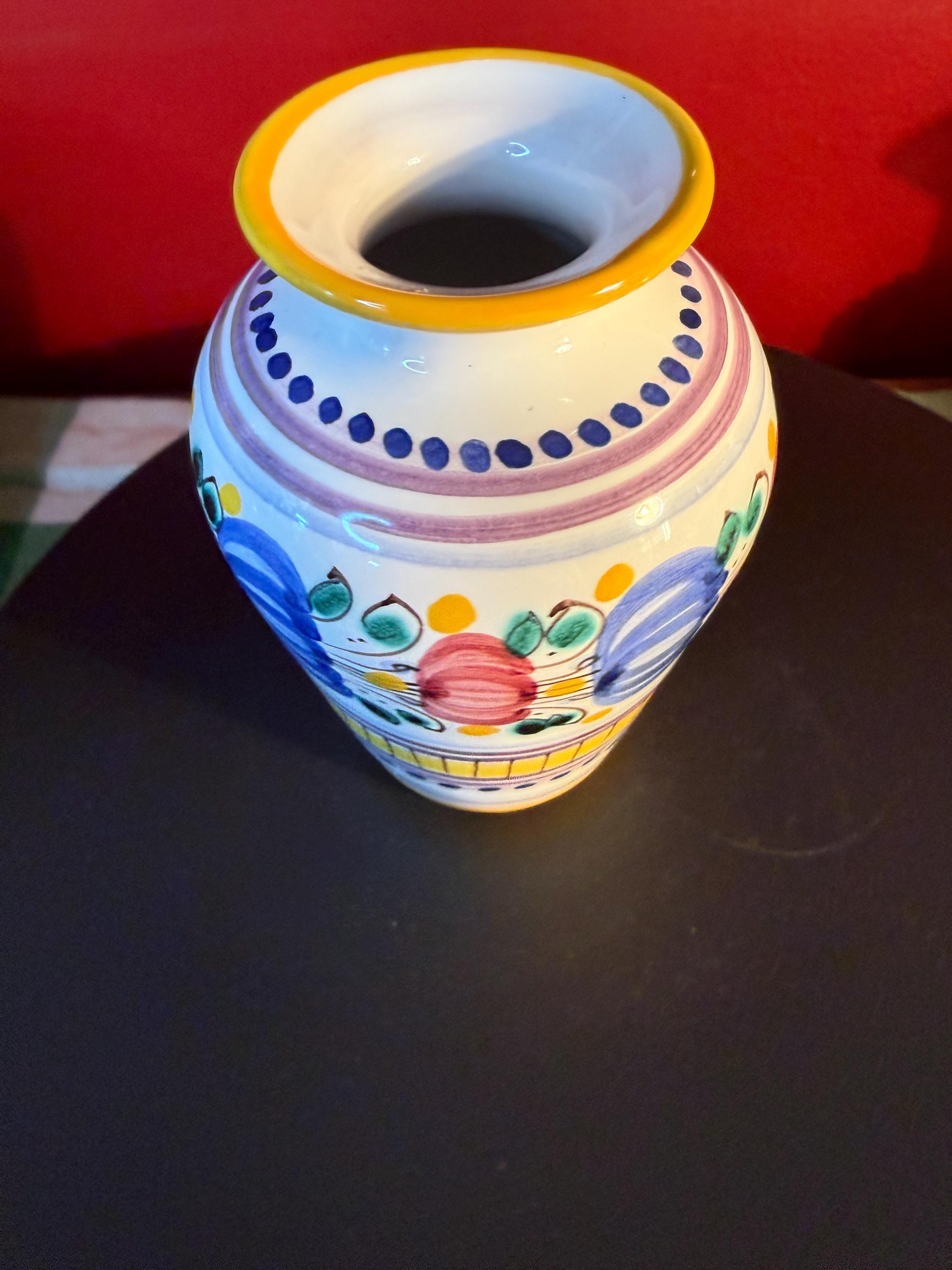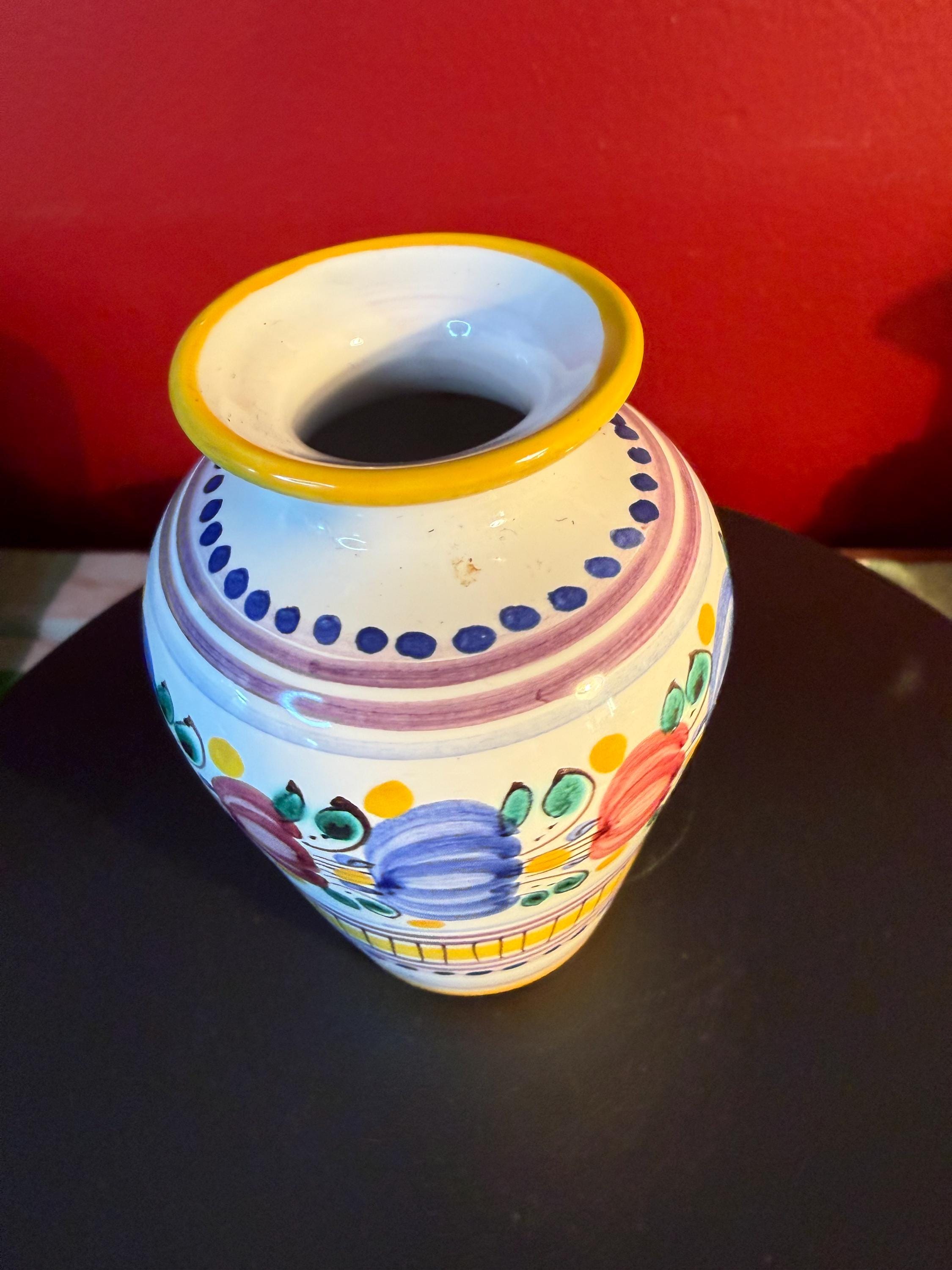 This charming VINTAGE MODRA SLOVAK LUDOVA MAJOLIKA CREMIG MINI VASE is a beautiful example of traditional Slovak pottery craftsmanship. Standing 3 inches tall, it features a creamy base adorned with hand-painted floral folk art motifs in vibrant blues, reds, greens, and yellows, accented by delicate purple stripes and dotted borders. The bright yellow rim adds a sunny finish, making this miniature vase a delightful accent piece for any collection.