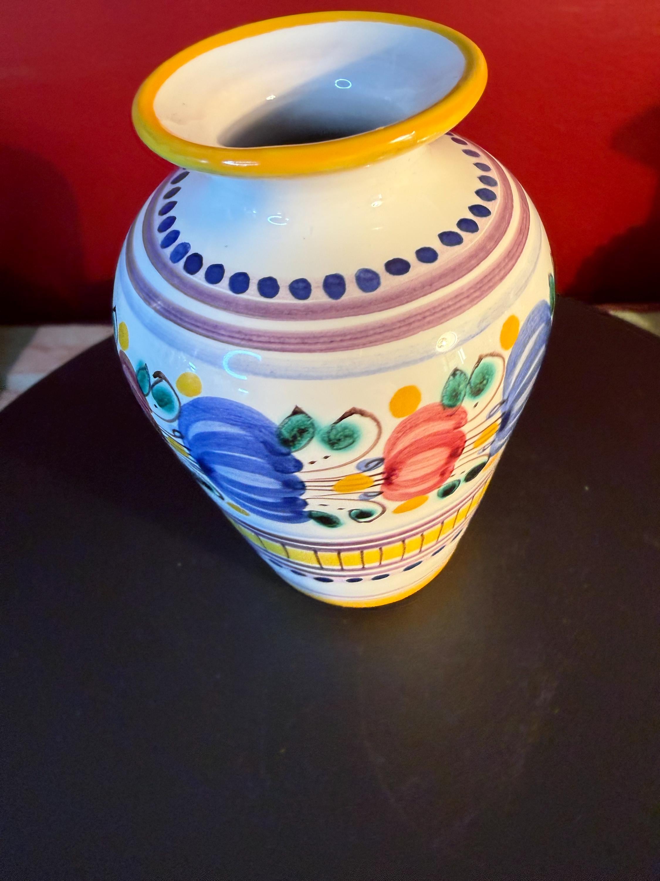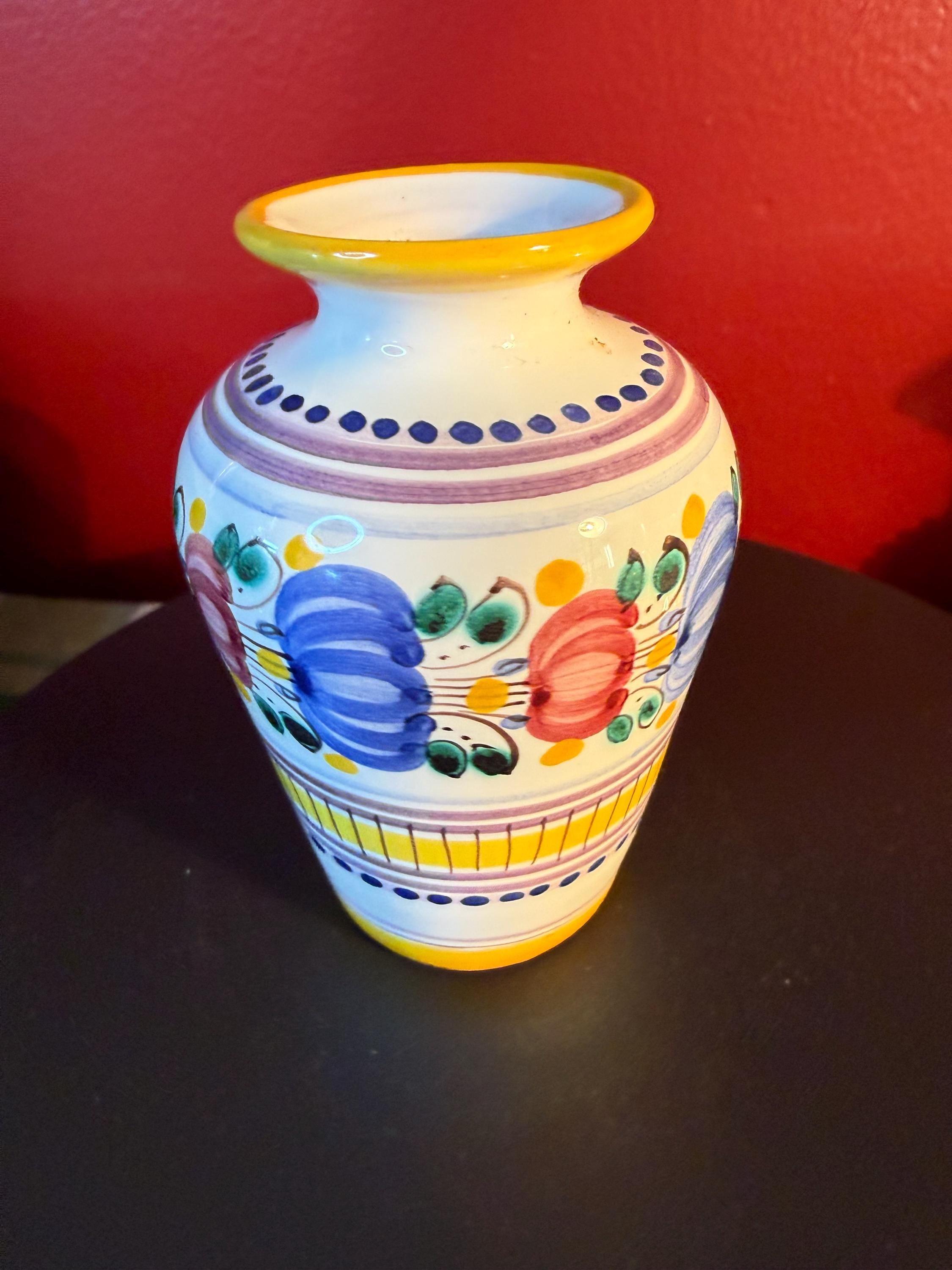 Perfect for collectors of vintage European ceramics or those seeking a unique small vase for fresh or dried flowers, this VINTAGE MODRA SLOVAK LUDOVA MAJOLIKA CREMIG MINI VASE blends functionality with decorative appeal. Its classic folk style and vivid colors evoke a sense of charm and heritage, ideal for display on a shelf, desk, or as a nostalgic gift for antique lovers and folk art enthusiasts alike.