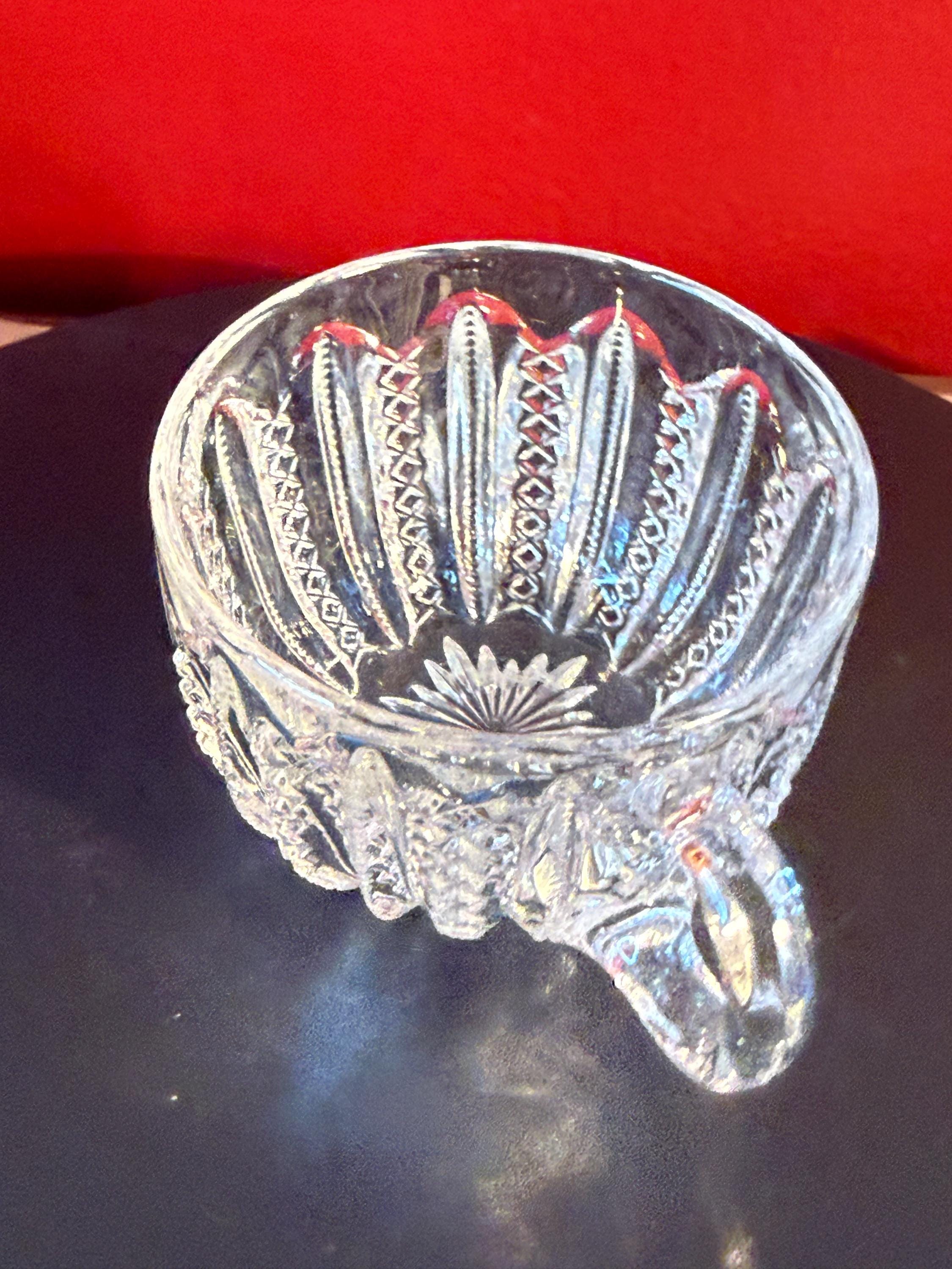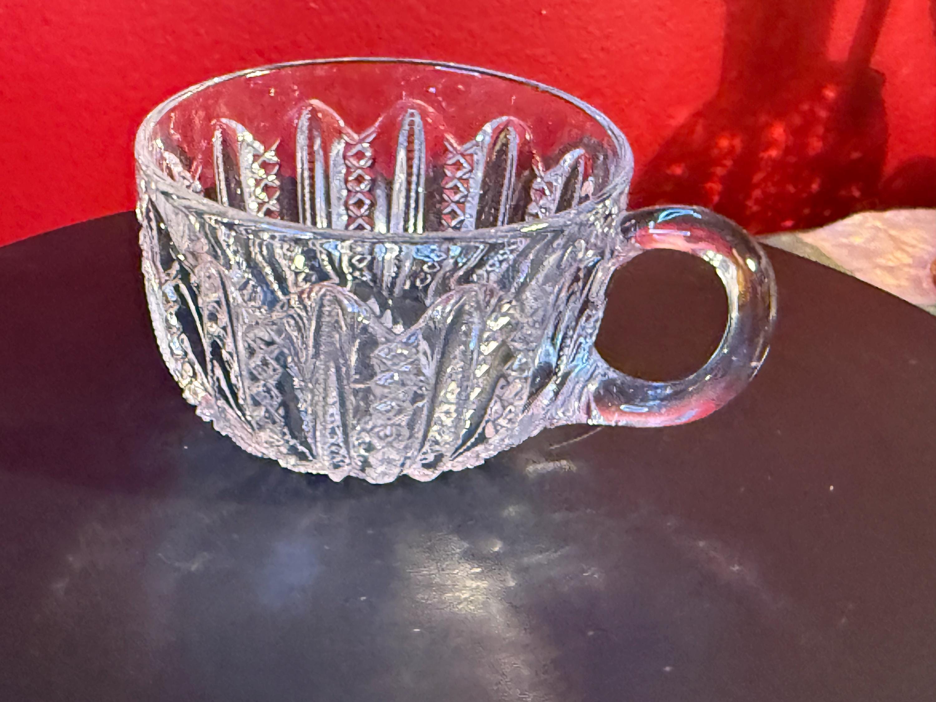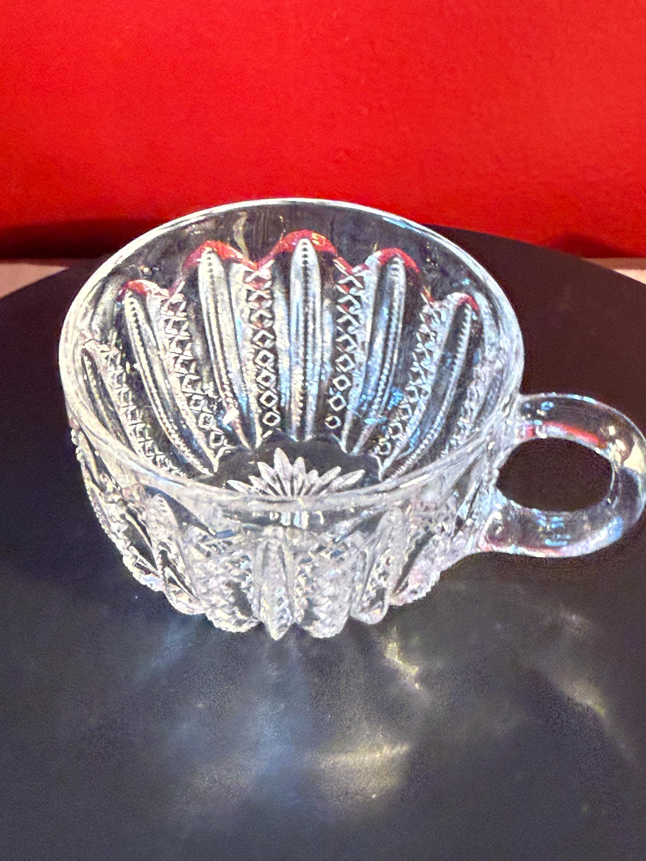 This Antique Duncan & Miller Mardi Gras Clear Pressed Glass Punch Bowl Cup is a beautifully crafted collectible from the late 19th to early 20th century (circa 1894-1920). Standing 2 1/4" high with a 3" opening, this cup showcases the intricate Mardi Gras pressed glass pattern, renowned for its detailed and elegant design. Its clear glass material enhances the vintage appeal, perfect for collectors or those looking to add a classic touch to their home decor.