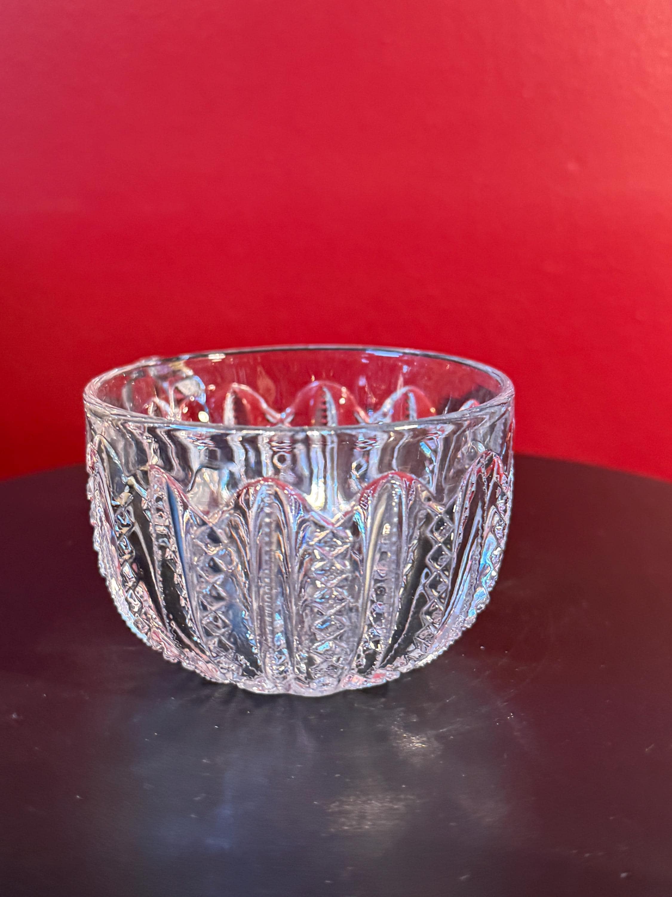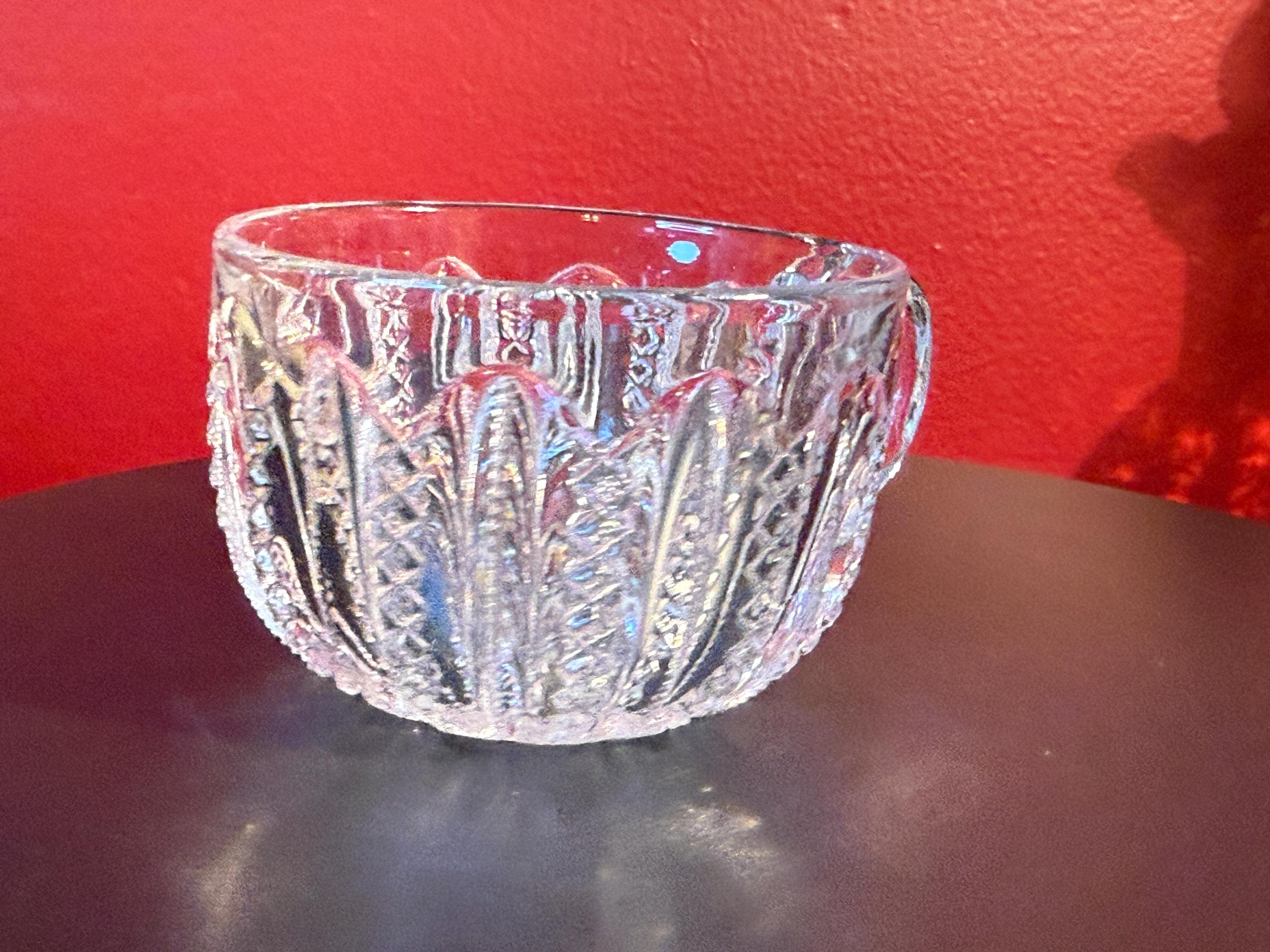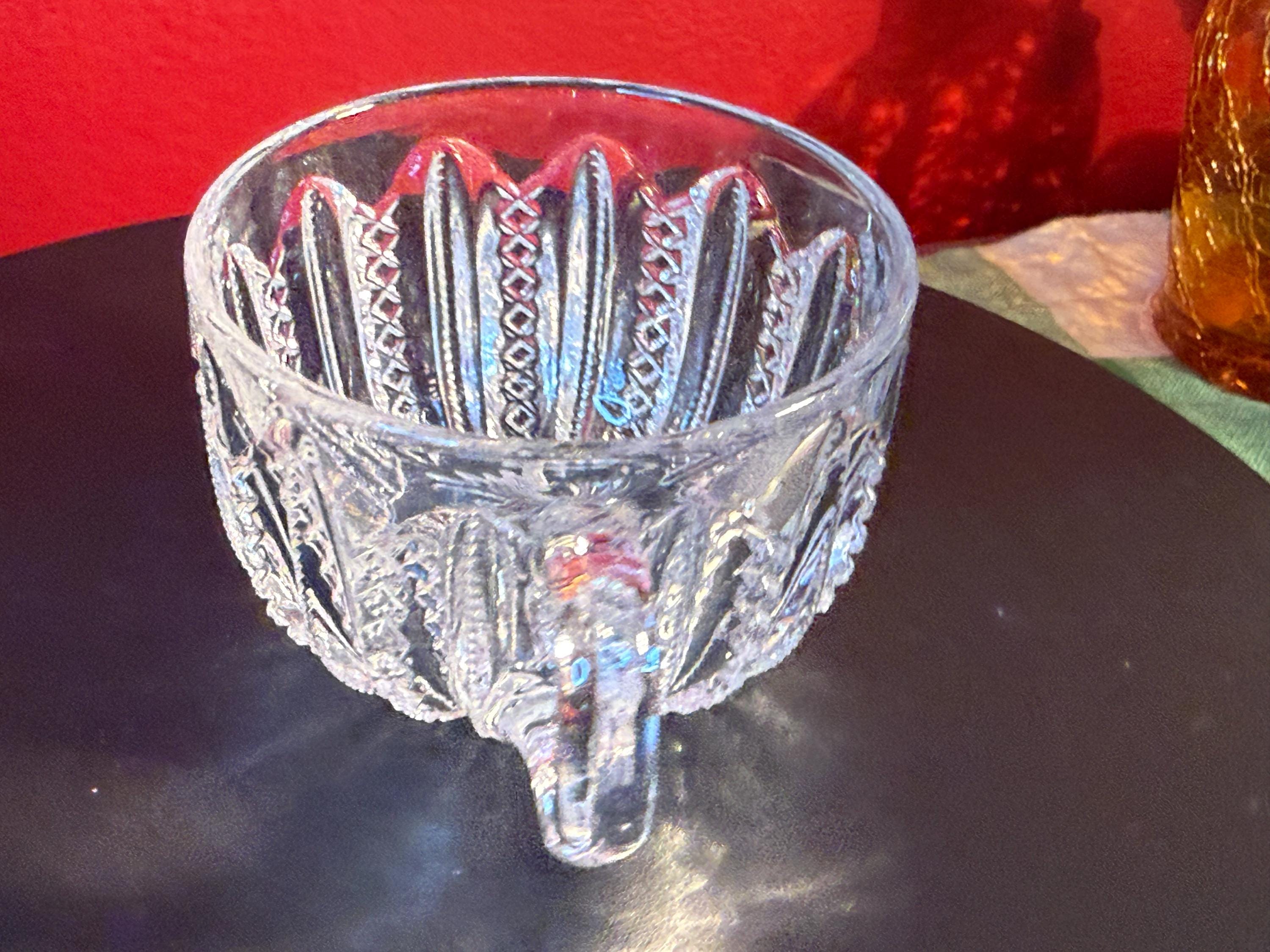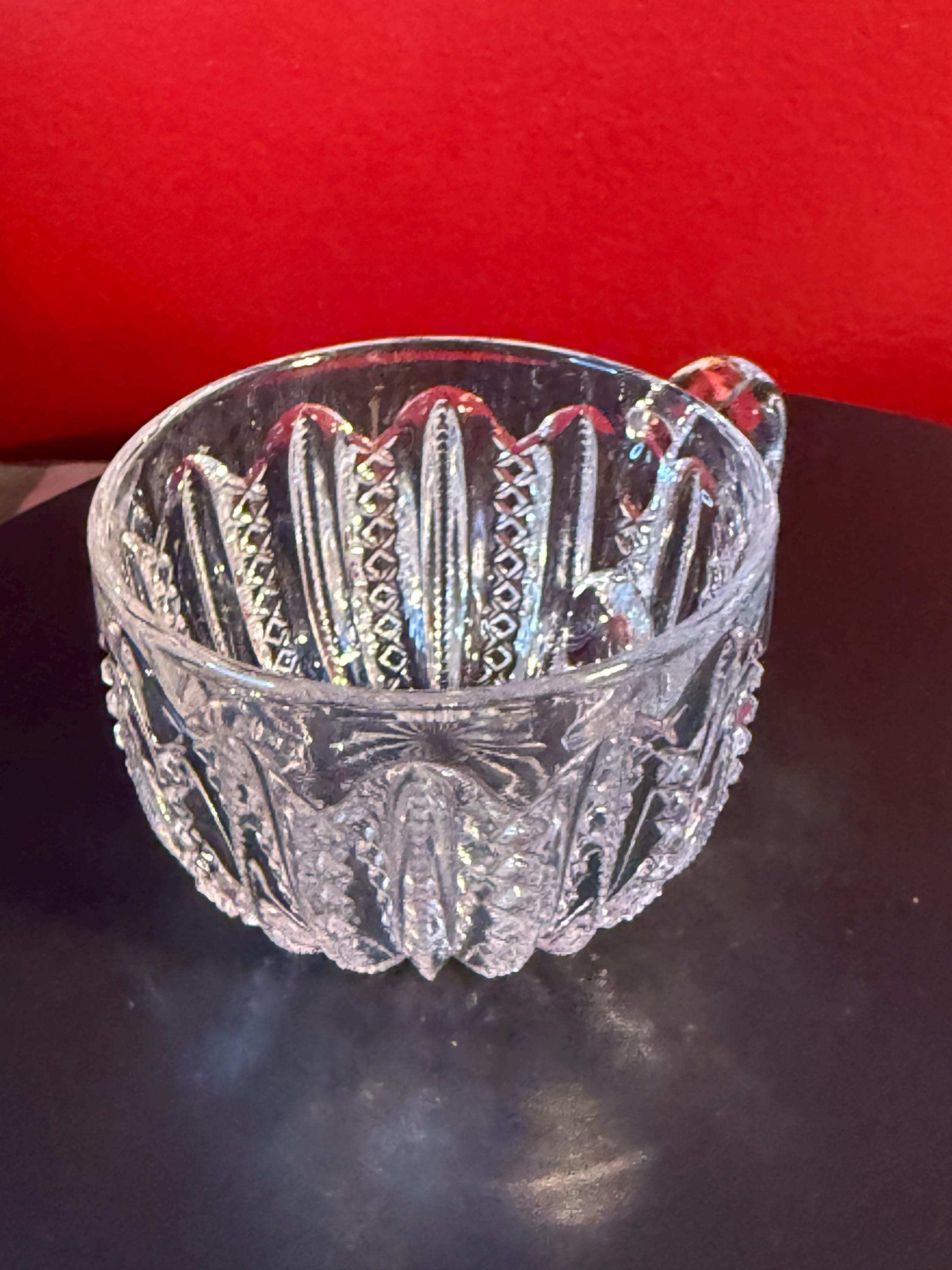 This Antique Duncan & Miller Mardi Gras Clear Pressed Glass Punch Bowl Cup is a beautifully crafted collectible from the late 19th to early 20th century (circa 1894-1920). Standing 2 1/4" high with a 3" opening, this cup showcases the intricate Mardi Gras pressed glass pattern, renowned for its detailed and elegant design. Its clear glass material enhances the vintage appeal, perfect for collectors or those looking to add a classic touch to their home decor.